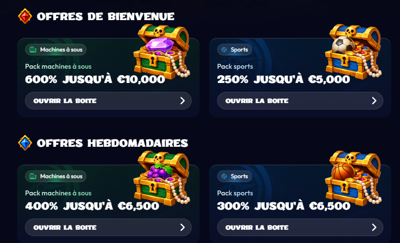 En plus de cet accueil généreux, des promotions régulières rythment chaque semaine : free spins, bonus sur recharge, challenges sportifs ou offres temporaires autour d’événements spéciaux. Il suffit de rester fidèle pour profiter de surprises additionnelles.