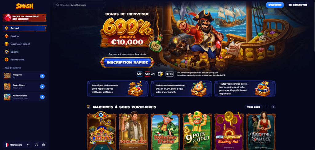 Lancé en 2026, Smash Casino surprend avec une approche moderne : il combine l’expérience du casino numérique à une section bookmaker dynamique, permettant de passer facilement des slots vidéo aux paris sportifs sans changer d’interface. Cette polyvalence s’ajoute à une identité visuelle immersive évoquant l’esprit pirate, donnant ainsi une vraie personnalité au site.