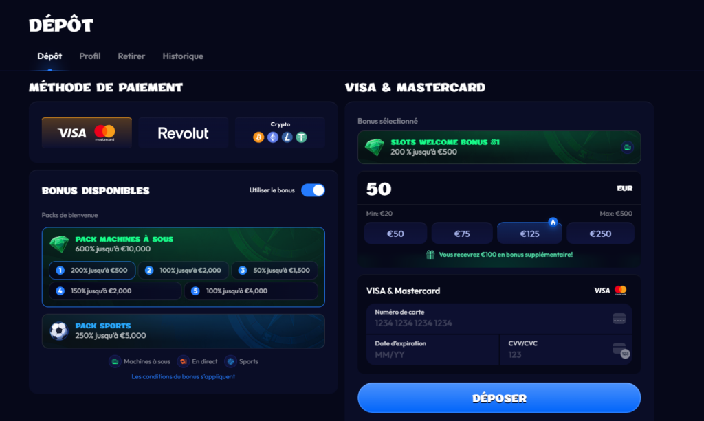 Un dépôt minimum de 10 € suffit pour commencer à jouer. À noter également : le casino applique parfois des frais selon la méthode utilisée – pensez à vérifier ce point lors de votre premier dépôt.
